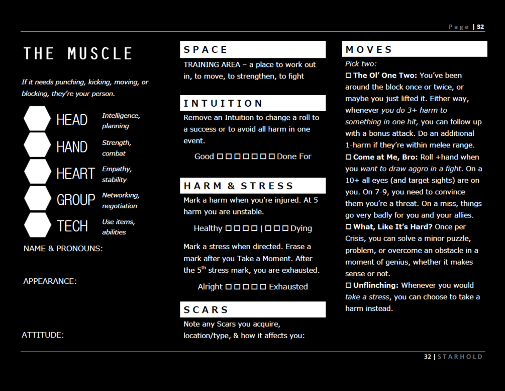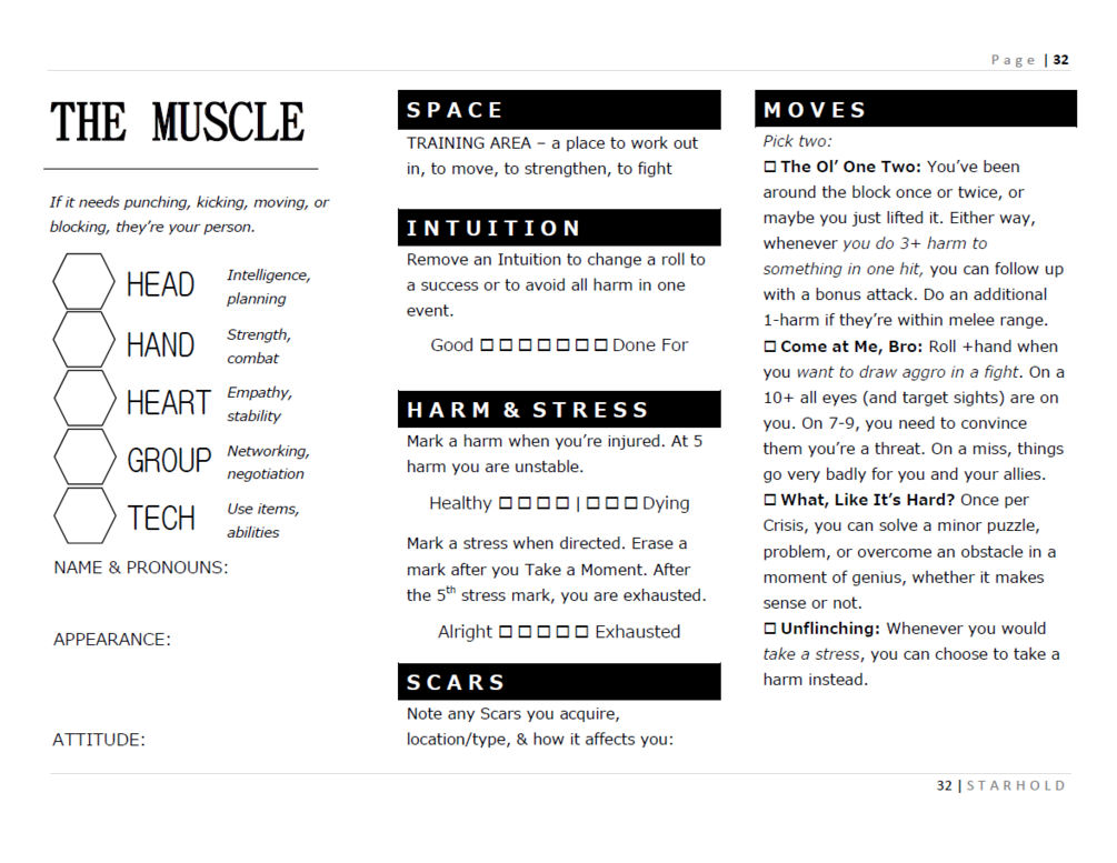 Starhold is a TTRPG using the Powered by the Apocalypse system. The .ZIP folder includes a copy of the handbook (in both light and dark modes), reference sheets for the GM and the players, and individual reference sheets for each playbook. All files are PDFs. An additional ZIP file is also available after your purchase that includes HD image files of some art from the book in 16:9 and 9:16 ratio formats.